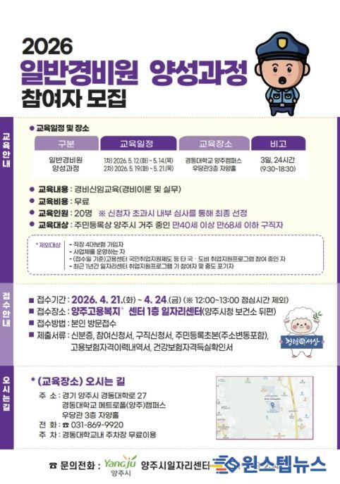 양주시가 오는 21일부터 24일까지 ‘2026년 취업지원프로그램 일반경비원 양성과정’ 교육생 20명을 모집한다.