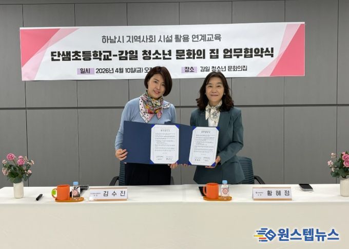 원스텝뉴스 이병희 기자 | 단샘초등학교는 4월 10일 감일 청소년 문화의 집과 학생 체험활동 확대 및 지역 연계 교육 강화를 위한 업무협약(MOU)을 체결했다고 밝혔다. 이번 협약은 학교와 지역사회 기관 간 협력을 통해 학생들에게 보다 다양한 교육 기회를 제공하고, 안전하고 의미 있는 체험 공간을 마련하기 위해 추진됐다.