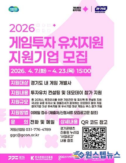 원스텝뉴스 이병희 기자 | 경기도와 경기콘텐츠진흥원이 게임기업의 성장을 지원하고 성공적인 투자유치를 위한 ‘2026년 게임 투자유치 지원사업’에 참여할 기업을 오는 23일까지 모집한다.