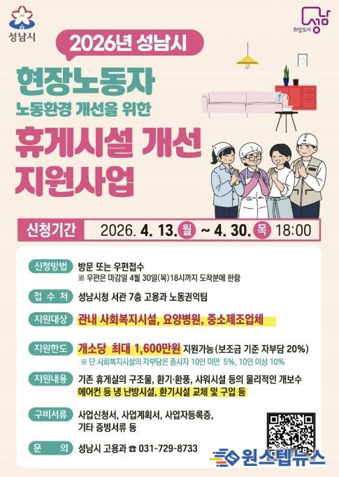 원스텝뉴스 이병희 기자 | 성남시는 휴게 여건이 열악한 민간 분야 현장노동자의 휴게권 보장과 노동환경 개선을 위해 사업장 휴게시설 개선 지원사업 참여기관과 기업을 추가 모집한다.