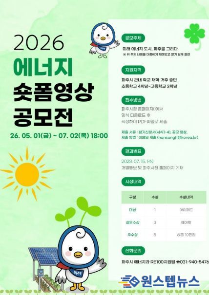 원스텝뉴스 이병희 기자 | 파주시는 청소년들의 에너지 인식을 제고하고 디지털 미디어 활용 역량을 강화하기 위해 녪년 파주시 청소년 에너지 숏폼 영상 공모전’을 개최한다.