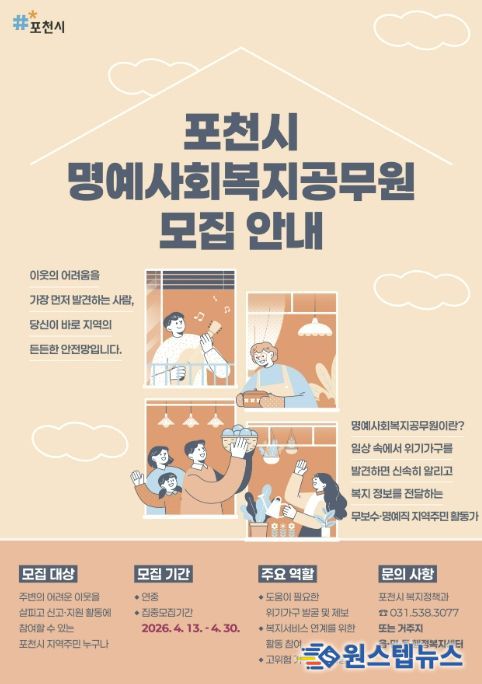 원스텝뉴스 이병희 기자 | 포천시는 복지사각지대 해소와 위기이웃 발굴을 위해 ‘명예사회복지공무원’을 오는 30일까지 집중 모집한다.