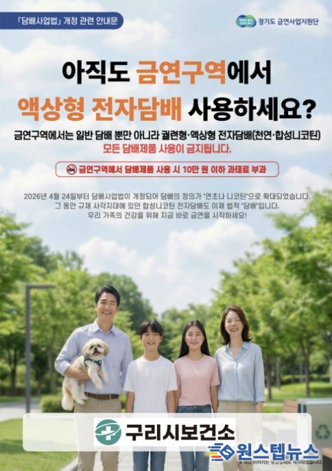 원스텝뉴스 이병희 기자 | 구리시 보건소는'담배사업법' 및 '국민건강증진법' 개정으로 담배의 정의가 확대됨에 따라, 지역사회 내 담배 규제 사항을 점검하고 금연 문화를 확산하기 위해 4월 24일부터 금연 구역 점검·단속과 금연 홍보 운동을 한다고 밝혔다.