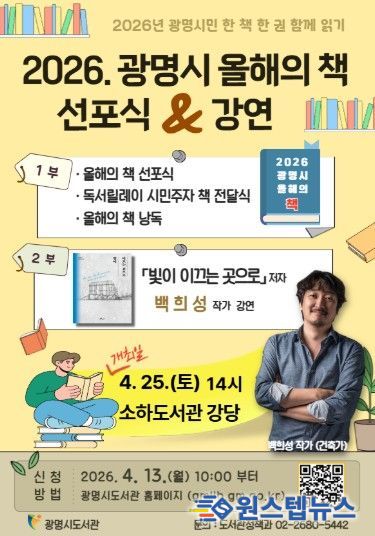 시는 오는 25일 오후 2시 소하도서관 강당에서 ‘2026년 광명시민 책 한 권 함께 읽기’ 올해의 책 선포식을 개최한다.