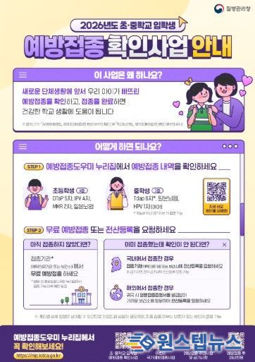 원스텝뉴스 이병희 기자 | 김포시는 13일, 2026학년 초·중학교 입학생을 대상으로 ‘예방접종 확인 사업’을 추진한다고 밝혔다. 이번 사업은 필수 예방접종 완료 여부를 확인하고 미접종자 및 접종이 지연된 학생에 대해 접종을 독려하기 위해 실시된다. 특히 단체생활을 시작하는 입학생 시기에 예방접종을 완료하도록 함으로써 감염병의 학교 내 확산을 사전에 차단하는 데 목적이 있다.