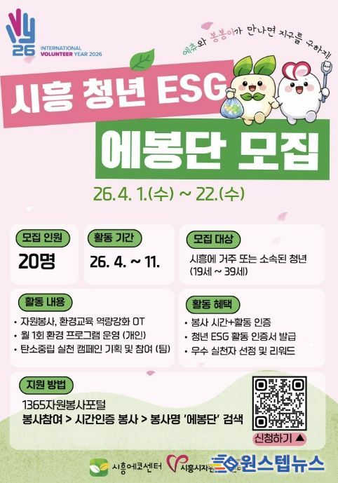 원스텝뉴스 이병희 기자 | 시흥시가 청년 주도의 환경 실천 확산과 ESG 가치 정착을 위해 ‘청년 ESG 에봉단’을 운영하는 가운데 1기 참여자 20명을 오는 4월 22일까지 모집한다.