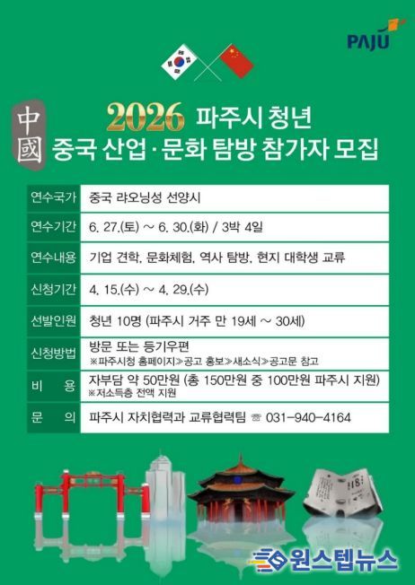 원스텝뉴스 이병희 기자 | 파주시는 관내 청년들의 국제 산업 환경에 대한 이해를 높이고 국제 역량을 강화하기 위해 녪파주시 청년 중국 산업·문화 탐방’프로그램 참가자를 모집한다.