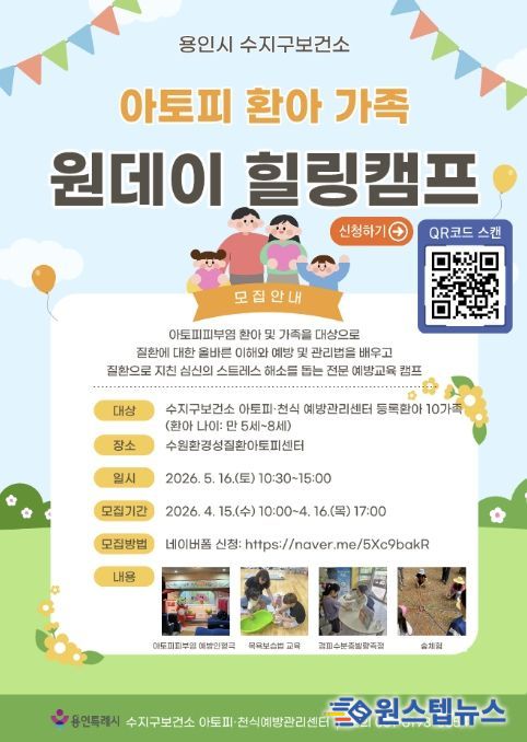 원스텝뉴스 이병희 기자 | 용인특례시 아토피·천식 예방관리센터는 아토피피부염 환아와 가족을 위한 ‘아토피 환아 가족 원데이 힐링캠프’ 참가자를 모집한다고 15일 밝혔다.