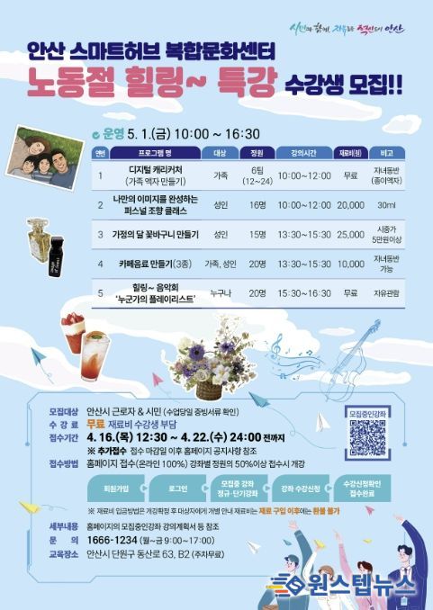 원스텝뉴스 이병희 기자 | 안산시는 올해 법정공휴일로 지정된 노동절(5월 1일)을 맞아 안산 스마트허브 복합문화센터(단원구 동산로 63)에서‘노동절 힐링 특강’을 운영한다고 15일 밝혔다.