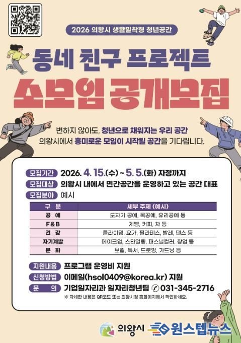 원스텝뉴스 이병희 기자 | 의왕시는 지역 청년들의 일상 속 문화·여가 활동을 지원하고 청년 공간 접근성을 높이기 위해 ‘2026 생활밀착형 청년 공간, 동네 친구 프로젝트’에 참여할 민간 공간 대표를 4월 15일부터 공개 모집한다고 밝혔다.