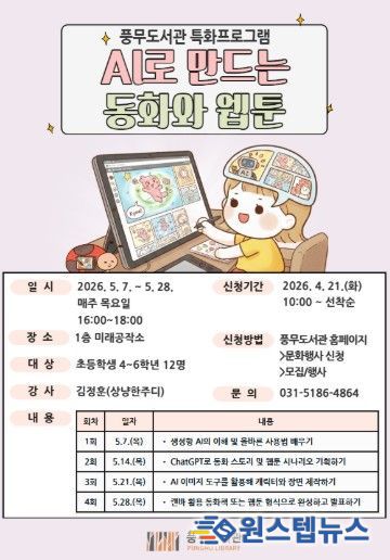 원스텝뉴스 천규영 기자 | 김포시 풍무도서관은 가정의 달을 맞아 초등학생 4~6학년을 대상으로 ‘인공지능(AI)으로 만드는 동화와 웹툰’을 오는 5월 7일부터 28일까지 매주 목요일 오후 4시부터 6시까지 총 4회에 걸쳐 운영한다.
