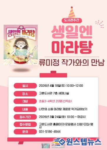 원스텝뉴스 천규영 기자 | 김포시 고촌도서관은 4월 18일 오전 10시에 초등학생 3~4학년을 대상으로 '오늘은 내가 마라탕 책 요리사'를 운영한다.