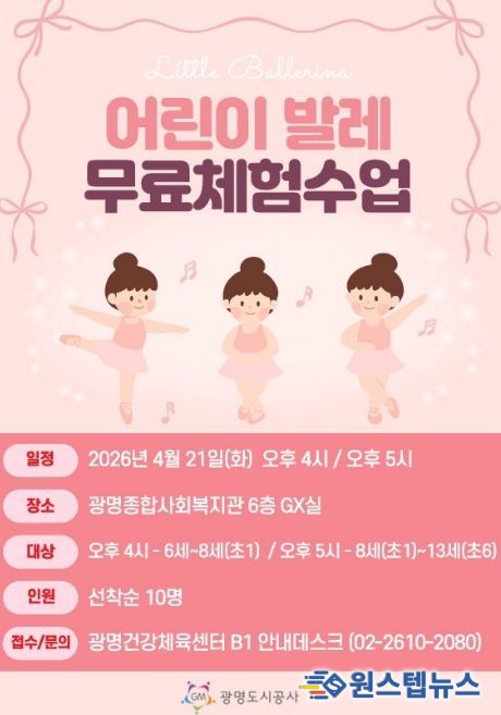 운영 프로그램은 K-POP 댄스와 어린이 발레 2개 종목으로 구성된다. 상세 일정은 ▲어린이 발레 4월 21일 ▲K-POP 댄스 4월 22일이며, 광명종합사회복지관 6층 GX실에서 진행될 예정이다.