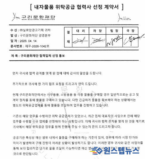 재단은 ‘내자물품 위탁공급 협력사 선정 계약서’ 등 실제 공문과 유사한 형식의 문서를 활용해 협력업체 선정을 통보하고, 물품 대리구매 등을 유도하는 사례가 확인됐다고 밝혔다.