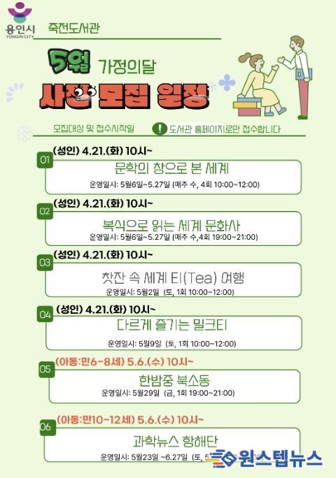 원스텝뉴스 이병희 기자 | 용인특례시 죽전도서관은 오는 5월 가정의 달을 맞아 ‘2026년 5월 독서문화행사’를 개최한다.