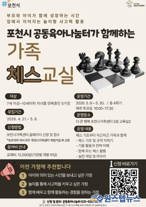 원스텝뉴스 이병희 기자 | 포천시 더 큰 행복 포천시가족센터는 공동육아나눔터 상시 프로그램의 일환으로 아동의 논리적 사고력 향상과 부모-자녀 간 긍정적 상호작용을 지원하기 위해 가족 참여형 체스 프로그램 '가족 체스 교실'을 운영한다고 밝혔다.