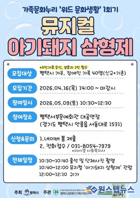 이번 1회기는 오는 5월 9일 오전 10시 30분부터 12시까지 평택서부문예회관에서 진행되며, 가족뮤지컬 ‘아기돼지 삼형제’관람 프로그램으로 운영된다. 공연 관람을 통해 가족 간 상호작용을 촉진하고 긍정적인 정서 경험을 통한 유대감 향상에 기여할 수 있을 것으로 기대된다.