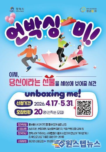 원스텝뉴스 이병희 기자 | 평택시 청년지원센터는 4월 17일부터 5월 31일까지 평택시에 거주하는 사회활동이 줄어 사람과의 만남이 거의 없거나 집 밖으로 나오기 힘든 청년의 일상 회복과 사회 참여 촉진을 위해 실시하는 지원사업 '언박싱 미!' 참여자를 모집한다.