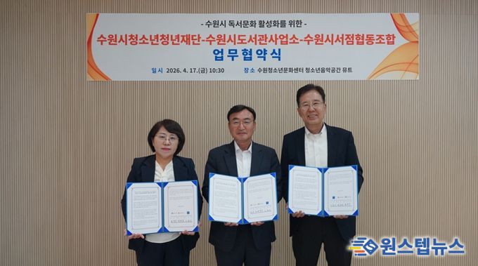 원스텝뉴스 이병희 기자 | 수원시청소년청년재단은 수원시도서관사업소, 수원시서점협동조합과 4월 17일 수원청소년문화센터에서 수원시 독서문화 활성화를 위한 업무협약을 체결했다.