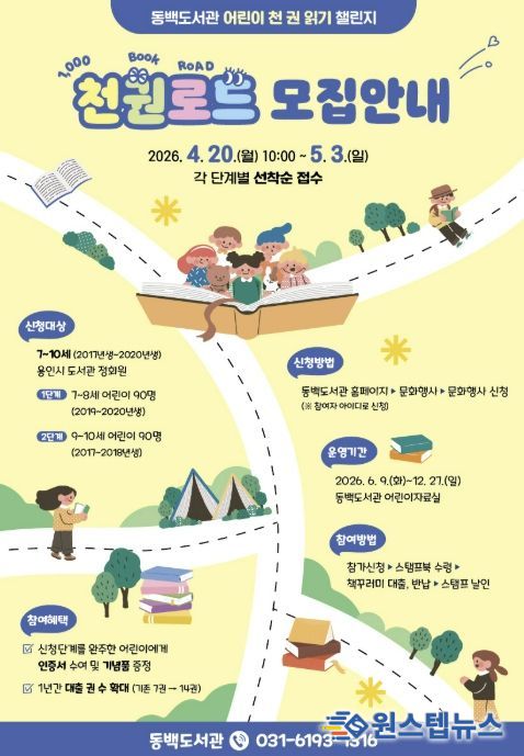 원스텝뉴스 이병희 기자 | 용인특례시 동백도서관은 어린이 천 권 읽기 챌린지 ‘천권로드(ROAD)’ 참여자를 모집한다고 20일 밝혔다.