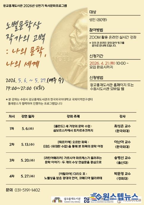 원스텝뉴스 이병희 기자 | 수원시 광교홍재도서관이 한국외국어대학교와 협력해 진행하는 2026년 세계문화기행 시리즈 1편 ‘노벨문학상 작가의 고백 : 나의 문학, 나의 세계’ 강좌를 수강할 시민을 모집한다.