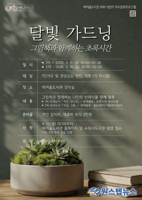 매여울도서관 관계자는 “그림책과 식물을 매개로 일상에 여유와 위로를 전하는 프로그램”이라며 “많은 시민들이 참여해 힐링의 시간을 보내길 바란다”고 말했다.
