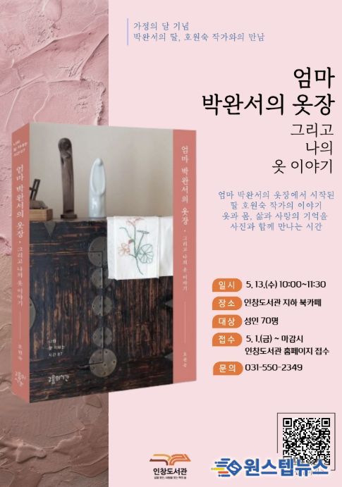 원스텝뉴스 이병희 기자 | 구리시립도서관은 '호원숙 작가와의 만남 ‘엄마 박완서의 옷장, 그리고 나의 이야기’' 참여 신청을 오는 5월 1일부터 접수한다고 밝혔다.