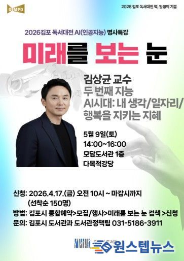 원스텝뉴스 천규영 기자 | 2026 김포 독서대전 ' 미래를 보는 눈: AI(인공지능) ' 명사 특강으로 김상균 교수의 강연이 오는 5월 9일 토요일 낮 2시 모담도서관에서 열린다.