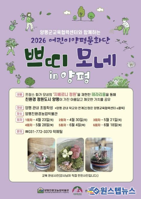 원스텝뉴스 이병희 기자 | 양평친환경농업박물관은 오는 4월부터 6월까지 양평 관내 초등학생을 대상으로 2026년 교육 프로그램 ‘어린이 양평문화단, 쁘띠 모네 in 양평’을 운영한다고 밝혔다.