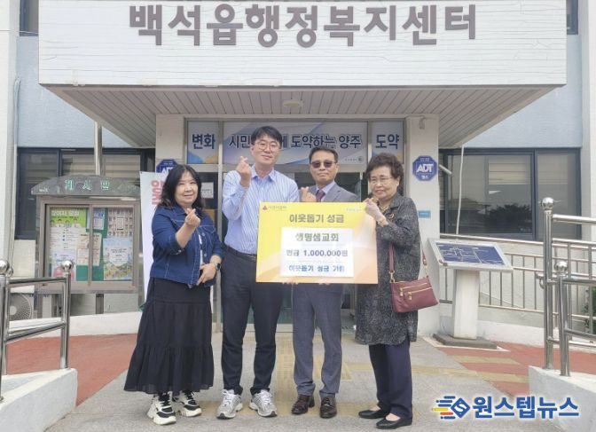 원스텝뉴스 이병희 기자 | 양주시 백석읍은 지난 17일 생명샘교회가 지역 내 어려운 이웃을 돕기 위한 성금 100만 원을 기탁했다고 밝혔다.