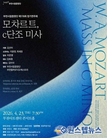 한편, 부천시립합창단 제178회 정기연주회 ‘모차르트, c단조 미사’는 부천아트센터 홈페이지 및 각종 예매처(NOL 티켓, 티켓링크, 예스24티켓)에서 예매할 수 있으며, 티켓 가격은 R석 2만원, S석 1만 5천원, A석 1만원이다.