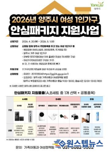 원스텝뉴스 이병희 기자 | 양주시는 관내 여성 1인 가구 등 범죄 취약 여성 가구의 안전한 일상을 지원하기 위해 ‘2026년 양주시 여성 1인 가구 안심패키지 지원사업’을 추진한다.