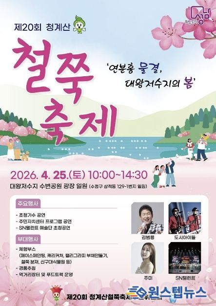원스텝뉴스 천규영 기자 | 성남시는 ‘제20회 철쭉 축제’가 오는 4월 25일 오전 10시~오후 2시 30분 수정구 상적동 대왕저수지 수변공원 광장에서 열린다고 21일 밝혔다.