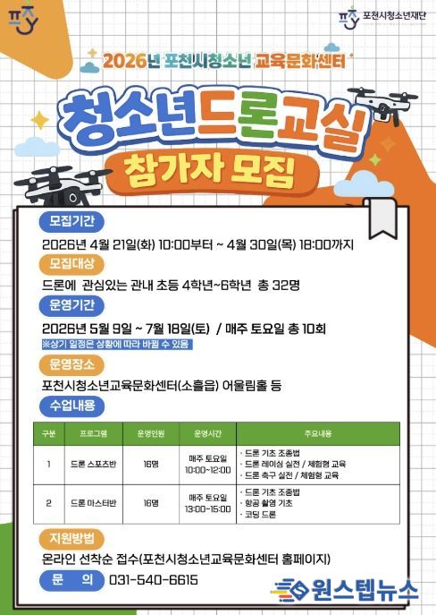 원스텝뉴스 이병희 기자 | (재)포천시청소년재단 포천시청소년교육문화센터는 오는 4월 21일부터 30일까지 관내 초등학교 4학년부터 6학년을 대상으로 청소년드론교실 1기 참가자를 선착순으로 모집한다고 밝혔다.