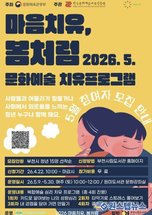 원스텝뉴스 이병희 기자 | 부천시립원미도서관 청년공간 ‘원미청정구역’이 문화체육관광부 주최하고 한국문화예술교육진흥원이 주관하는 ‘2026 마음치유, 봄처럼’ 사업 협력기관으로 선정돼 청년 대상 문화예술 치유 프로그램을 운영한다고 21일 밝혔다.
