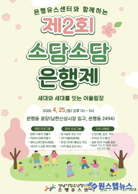 원스텝뉴스 천규영 기자 | 성남시청소년청년재단 은행유스센터는 오는 4월 25일 오후 1시부터 5시까지 은행동 광장에서 청소년과 지역 주민이 함께하는 ‘제2회 소담소담 은행제’를 개최한다.