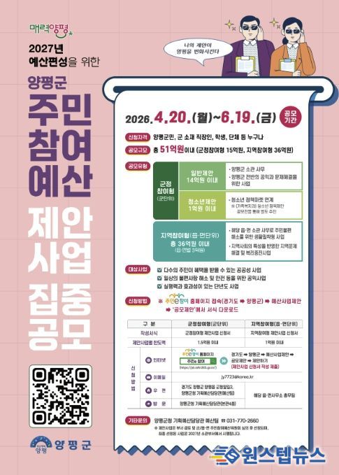 원스텝뉴스 이병희 기자 | 양평군은 오는 6월 19일까지 2027년 예산에 반영할 ‘주민참여예산 제안사업’을 집중 공모한다고 밝혔다.