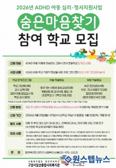 원스텝뉴스 이병희 기자 | 고양시일산종합사회복지관은 ADHD 아동의 학교 적응을 돕기 위한 심리·정서지원사업 ‘숨은마음찾기’에 참여할 학교를 모집한다고 21일 밝혔다.