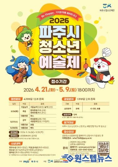 원스텝뉴스 천규영 기자 | (재)파주시청소년재단 금촌청소년문화의집은 오는 4월 21일부터 5월 9일까지 ‘2026 파주시청소년예술제’ 참가자를 모집한다고 밝혔다. 올해‘Be Happy, 무대위에 피어나다’를 부제로 개최되는 이번 예술제는 제34회 경기도청소년예술제 파주시 공식 예선으로, 파주시 청소년이라면 누구나 참가 신청이 가능하다.