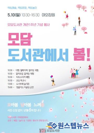 원스텝뉴스 천규영 기자 | 김포 최대 규모 공공도서관인 모담도서관이 개관 1주년을 맞아 오는 5월 10일 ‘책과 문화·예술·놀이’가 어우러지는 행사를 연다. 이번 행사는 시민들에게 감사의 마음을 전하고 복합문화공간으로서의 역할을 수행하고자 마련된 것으로, 사전예약 없이 도서관 방문자 누구나 참여 가능하다.