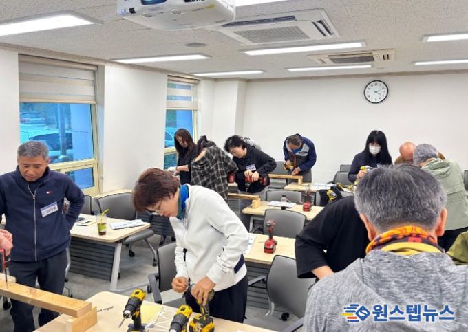 이번에 개강한 집수리아카데미 4기 과정은 주거환경 개선을 위한 간단한 수리 기술 및 홈셀프인테리어 방법을 습득하는 교육으로 ▲공구 사용법 실습 ▲방충망 ▲생활전기 이론 및 실습 ▲건축목공 이론 및 실습 ▲단열의 원리 실습 ▲도배 ▲타일 ▲수전, 샤워기 등 생활설비 그리고 2회의 찾아가는 재능기부로 구성했다.