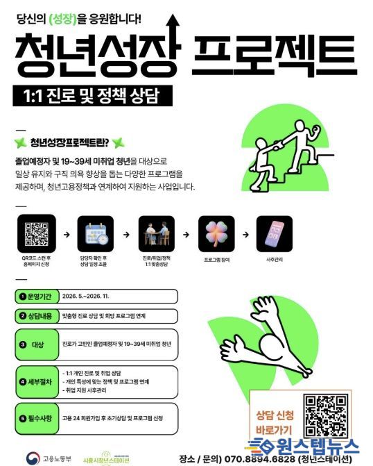참여 신청은 청년스테이션 현장 또는 ‘고용24’ 누리집 내 청년성장프로젝트 페이지를 통해 가능하다. 프로그램은 5월부터 전문 상담사의 1대1 진단을 바탕으로 개인별 맞춤형 과정으로 운영된다.