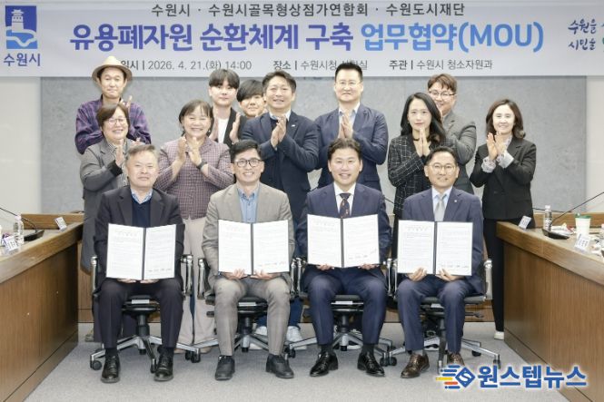 수원시는 21일 시청 상황실에서 수원시골목형상점가연합회, 수원도시공사, 수원도시재단과 ‘유용 폐자원 순환 체계 구축 업무협약’을 체결하고, 협력을 약속했다.