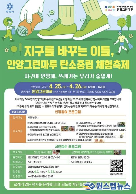 이와 함께 이달 25일부터 26일까지 안양그린마루(만안구 화창로 10)에서 ‘지구를 바꾸는 이틀, 안양그린마루 탄소중립 체험 축제’가 열린다.