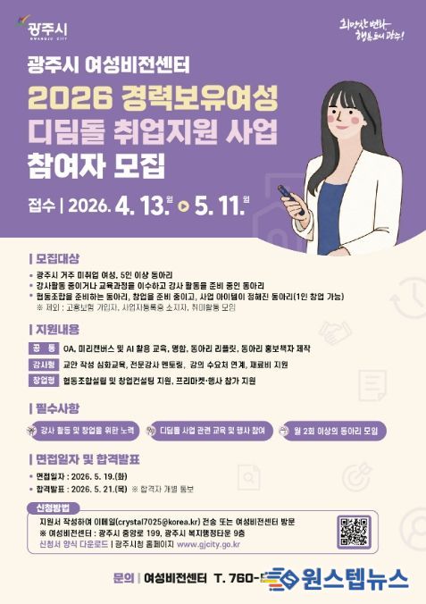 원스텝뉴스 이병희 기자 | 광주시는 지역 내 경력보유여성의 사회 재진출과 취업 역량 강화를 위해 ‘2026 경력보유여성 디딤돌 취업 지원 사업’ 참여자를 오는 5월 11일까지 모집한다고 22일 밝혔다.