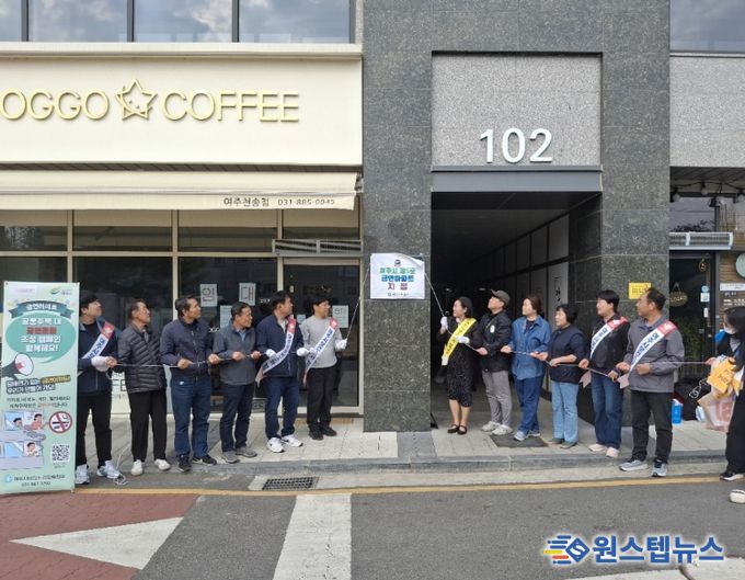 원스텝뉴스 이병희 기자 | 여주시보건소 건강증진과는 지난 4월 17일 여주시 제5호 공동주택 금연구역(금연아파트)으로 지정된 여주시 서해스카이 팰리스 아파트에서 현판식을 개최했다.