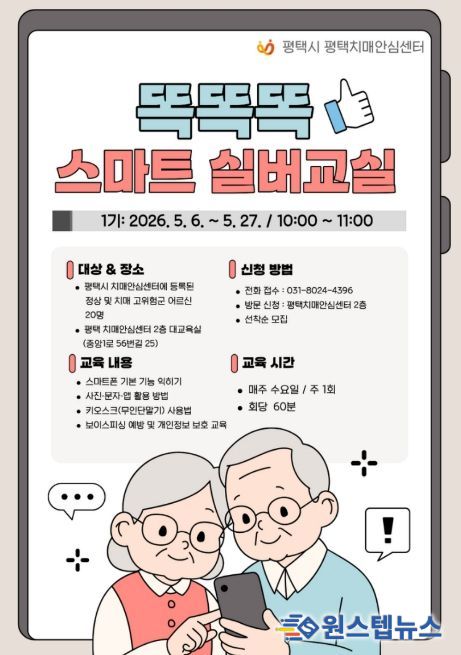 원스텝뉴스 이병희 기자 | 평택치매안심센터는 오는 5월 6일부터 27일까지 치매 예방 및 인지 기능 강화를 위한 ‘똑똑똑 스마트 실버교실’을 운영한다고 밝혔다.