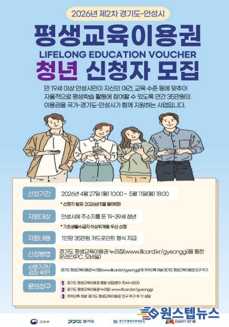 원스텝뉴스 이병희 기자 | 안성시는 시민의 평생학습 참여 기회를 두텁게 보장하기 위해 오는 4월 27일 오전 10시부터 5월 11일 오후 6시까지 ‘2026년 제2차 경기도-안성시 평생교육이용권’ 지원 대상자를 모집한다고 밝혔다.