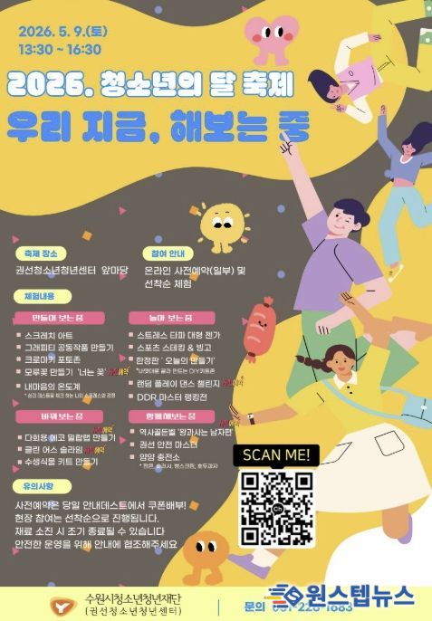 원스텝뉴스 천규영 기자 | 수원시청소년청년재단 권선청소년청년센터가 오는 5월 9일, 청소년이 주인공이 되어 직접 경험하고 도전하는 참여형 축제 ‘지금우리, 해보는중’을 개최한다고 밝혔다.