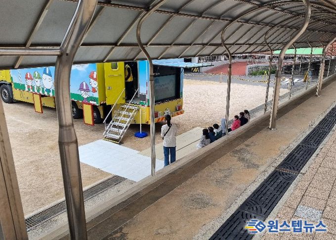 이번 교육은 이론 중심의 안전교육에서 벗어나 학생들이 직접 체험을 통해 재난 상황 대처 방법을 익히도록 하기 위해 마련됐다. 학교 운동장에 설치된 특수 제작 차량 내부에서 다양한 상황을 간접적으로 경험하는 방식으로 진행됐다.